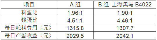 將10000羽雞分為兩組,分別飼喂黑馬B4022和另一知名品牌5%蛋雞料,用料32天后,計算實證數(shù)據(jù)核算經(jīng)濟效益,為后期全群飼喂提供精確依據(jù),飼喂數(shù)據(jù)如下: