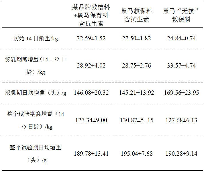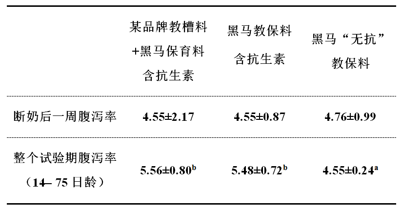 此試驗結果表明:黑馬無抗教槽料、保育料在乳仔豬生長性能、腹瀉率指標上的表現可以達到現有同類含抗生素產品,甚至在保育期控制腹瀉率上明顯優于含抗生素產品。