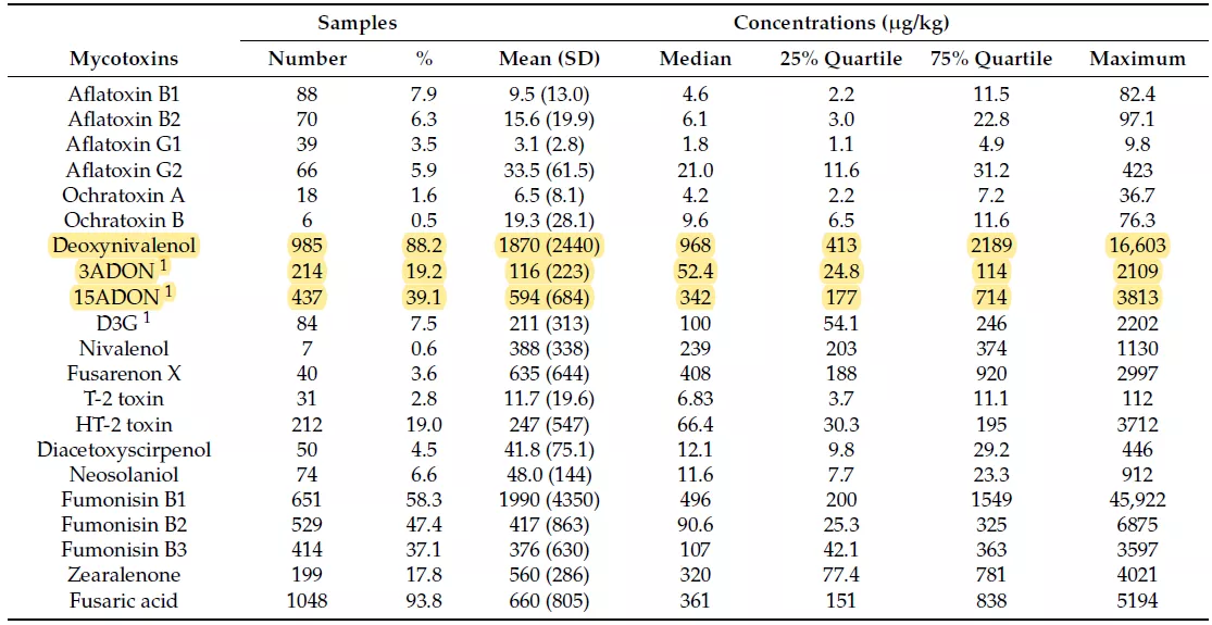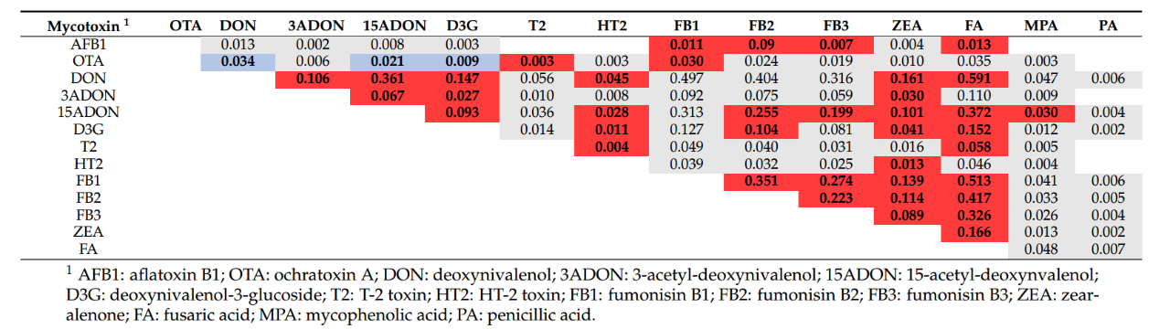 表1.玉米樣品中不同類型霉菌毒素同時出現的概率