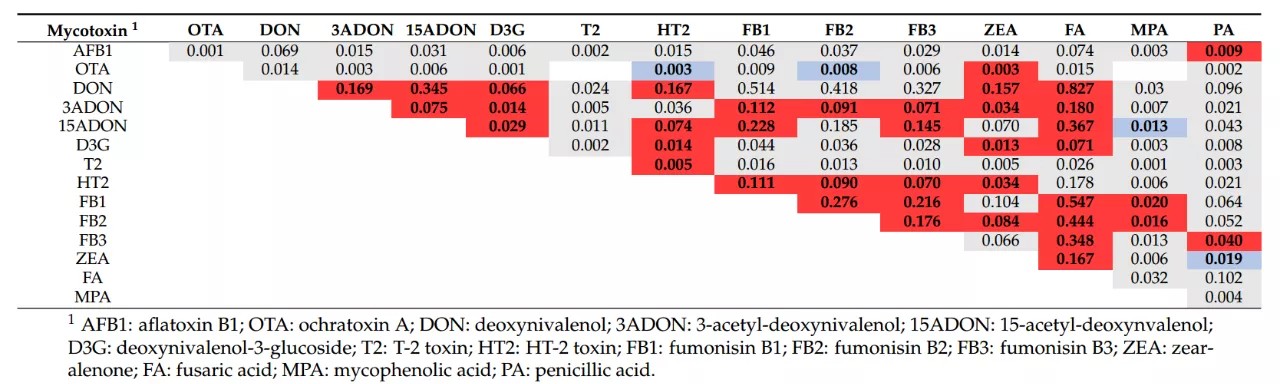 據Weaver等(2021)發表在Toxins上一篇持續7年、累計828個樣品、對35種霉菌毒素的調查報告,單胃動物日糧的主要原料玉米樣品(n=711)中,萎蔫酸(FA)和嘔吐毒素(DON)成對出現的概率最大,為0.591(p<0.001)。而萎蔫酸檢出時,伏馬毒素B1、B2、B3(FB1、FB2、FB3)出現的概率較大,分別為0.513(p<0.001)、0.417(p<0.001)、0.326(p<0.001),詳見表1。