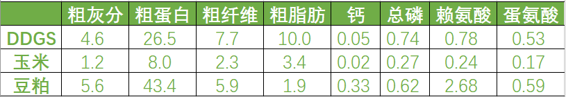 DDGS、玉米及豆粕營養(yǎng)指標對比(%)