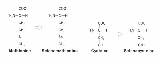 在酵母發(fā)酵過程中加入適量的無機硒,利用酵母對硒的富集效應(yīng),就能生產(chǎn)出有機形式硒。酵母硒中的有機硒包括硒代蛋氨酸、硒代胱氨酸、CH3SeH(甲基硒酸)、含硒蛋白質(zhì)及其它硒化物。其中,硒代蛋氨酸占比最高,其次是硒代胱氨酸。這兩種硒化氨基酸的結(jié)構(gòu)與常規(guī)氨基酸蛋氨酸(Met)和半胱氨酸(Cys)相同,只是硒取代了硫原子。